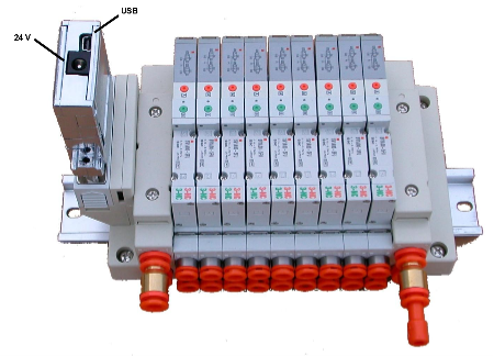 SPN's USB Interface Module pictured at right is connected to a SMC Solenoid Block. The only wiring used to control up to 20 valves is a USB comm and a +24 V DC plug.